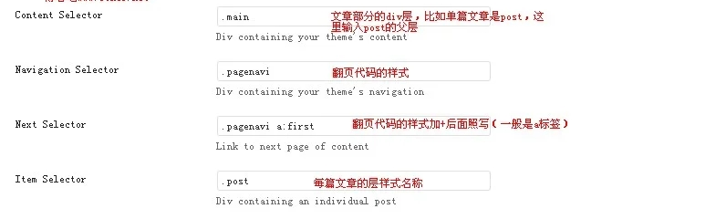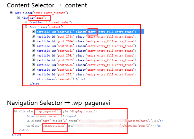 Content Selector 文章列表页面最外层容器名称;单篇文章层的父层,如下面的代码,文章 div 层的父层便是.main