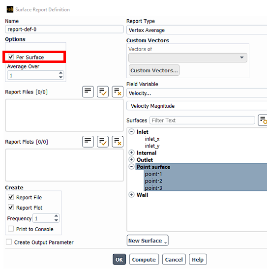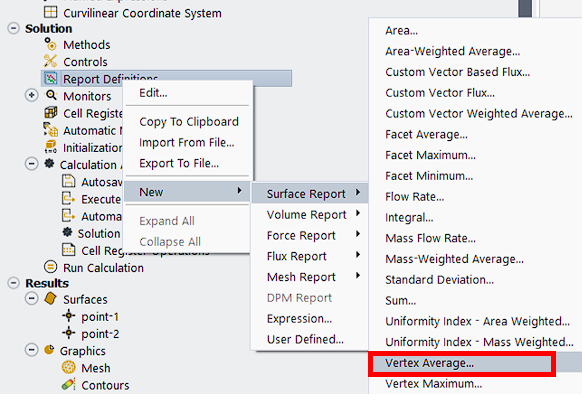 在”report definitions“中,可基于”surface report“类型创建监测点的数据监测。其类型建议为”vertex average“。