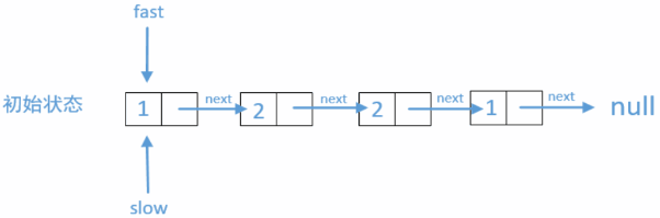 思路2:不使用辅助空间 两个指针,一个指向头 first,指向头的后继节点 last;first 走一步,last走两步;直到 last 为空或 last 的后继节点为空,此时 first 指向(链表长度为奇数,指向中间;为偶数,指向一半);然后 fisrt 向后走,再申请一个节点指向头,不断进行比较,直到 first 指向空。