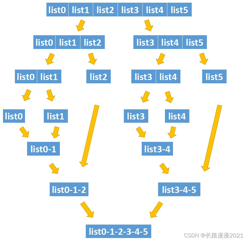 class Solution:def mergeKLists(self, lists: List[ListNode]) -> ListNode:if not lists: return Nonen = len(lists) # 记录子链表数量return self.mergeSort(lists, 0, n - 1) # 调用归并排序函数def mergeSort(self, lists: List[ListNode], l: int, r: int) -> ListNode:if l == r:return lists[l]m = (l + r) // 2L = self.mergeSort(lists, l, m) # 循环的递归部分R = self.mergeSort(lists, m + 1, r)return self.mergeTwoLists(L, R) # 调用两链表合并函数def mergeTwoLists(self, list1: Optional[ListNode], list2: Optional[ListNode]) -> Optional[ListNode]:prehead = ListNode(-1) # 哨兵节点prev = prehead # 指针节点while list1 and list2:if list1.val <= list2.val:prev.next = list1list1 = list1.nextelse:prev.next = list2list2 = list2.nextprev = prev.nextprev.next = list1 if list1 else list2return prehead.next