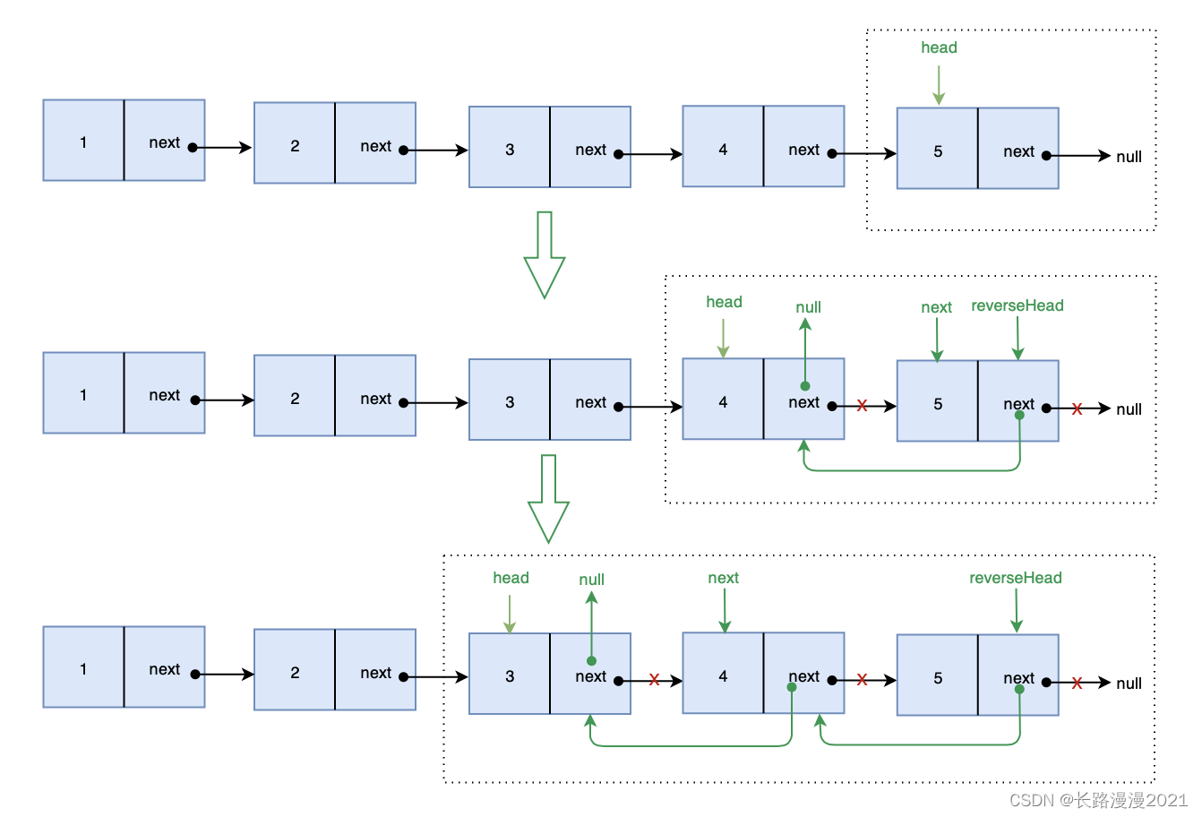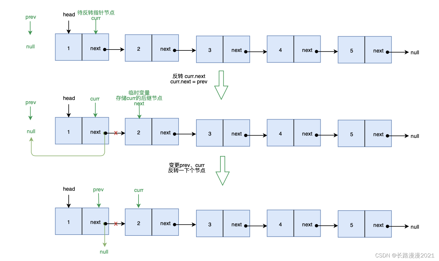 class Solution:def reverseList(self, head: Optional[ListNode]) -> Optional[ListNode]:if head == None or head.next == None:return head# reverse_head 表示 head.next 后面一整段反转之后的头结点,所以最后return reverse_headreverse_head = self.reverseList(head.next)head.next.next = head # 此时 head.next 指向的已经是反转部分的尾巴head.next = None # head 指向 None,表示此时 head 已经是尾巴了return reverse_head