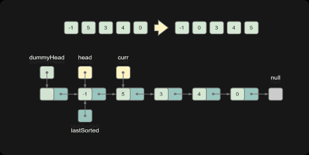 class Solution:def insertionSortList(self, head: Optional[ListNode]) -> Optional[ListNode]:dummy = ListNode(-1, head) # 会移动头结点,这里虚拟头结点last_sorted, curr = head, head.next # last_sorted 维护已排序部分的最后一个位置;curr 为遍历的待插入元素while curr: # 外层循环遍历完链表所有数;内层循环遍历[head, lastSort]这段位置找插入if curr.val >= last_sorted.val:last_sorted = last_sorted.next # 大,直接后移,或者直接 last_sorted = curelse:prev = dummy # 用来遍历已经排序的部分while prev.next.val <= curr.val: # 从前往后比较,找插入的位置prev = prev.nextlast_sorted.next = curr.next # 找到位置进行插入操作curr.next = prev.nextprev.next = currcurr = last_sorted.next # 指针后移return dummy.next