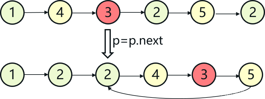 如果不断开直接 p = p.next,p 是正常往下走了,但是其中有个问题就是会陷入无限循环。以本题为例,由于14325的5在被p2连起来之后,其由于指向 p,因此 p.next 也是被继承过来的,所以后面是2,而 p 直接等于 p.next 后判断为2后,就直接加到 p1 后面了。现在问题就是 p1 中的 第一个2 指向的 第二个2 和 p2 中的 5 指向的 2 是一个指针(地址),不把他们俩合并还好说,一旦合并,就成了 下图所示.的1-->2-->2-->4-->3-->5-->2|-->4-->3-->5-->2|-->4-->...,看出来了吗?形成了一个环了!