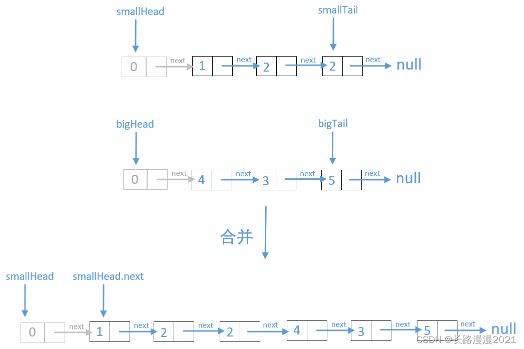 class Solution:def sortList(self, head: Optional[ListNode]) -> Optional[ListNode]:return self.split_list(head) def split_list(self, head: ListNode): '''处理归并排序的边界问题,下面两种场景都不需要进行分合操作'''if not head or not head.next:return headprev, slow, fast = head, head, headwhile fast and fast.next: # 找中点,偶数找的后面那个中点的位置,奇数找到中点prev = slowslow = slow.nextfast = fast.next.nextprev.next = Noneleft, right = head, slow # 将链表分割成两个子链表return self.merge_sort(self.split_list(left), self.split_list(right)) # 分割完后,进行合并部分操作def merge_sort(self, head1: ListNode, head2: ListNode) -> ListNode:'''归并环节'''dummy_head = ListNode(0) # 构建虚拟头结点temp, temp1, temp2 = dummy_head, head1, head2while temp1 and temp2: # 开始合并操作if temp1.val <= temp2.val:temp.next = temp1temp1 = temp1.nextelse:temp.next = temp2temp2 = temp2.nexttemp = temp.nextif temp1: # 如 temp1, temp2 还存在不为空的链表,将剩余部分赋值给 temp.nexttemp.next = temp1elif temp2:temp.next = temp2return dummy_head.next