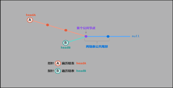 思路:若两个不带环的链表相交,则他们的尾节点必相同;若要求交点,则需要比较两个链表的长度,让较长的链表先向后遍历至和较短的链表长度相等,然后两个链表同时向后遍历,并比较节点是否相同,当遇到第一个相同的节点时,则为两个链表的交点。