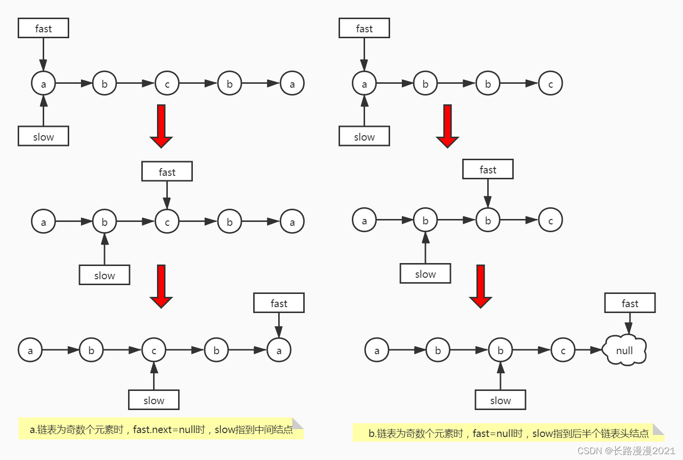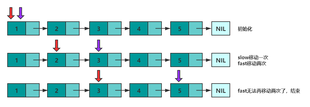 设有两个指针 fast 和 slow,初始时指向头节点。每次移动时,fast 向后走两次,slow 向后走一次,直到 fast 无法向后走两次。这使得在每轮移动之后。fast 和 slow 的距离就会增加一。设链表有 n 个元素,那么最多移动 n/2 轮。当 n 为奇数时,slow 恰好指向中间结点,当 n 为 偶数时,slow 恰好指向中间两个结点的靠后一个。