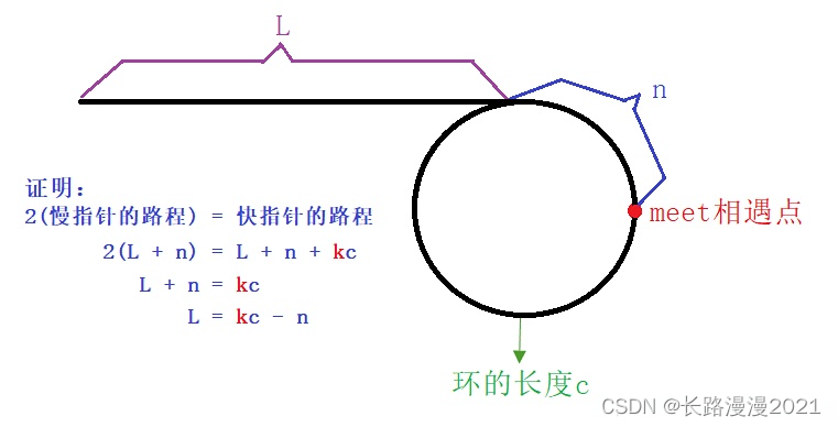 通过公式的推导我们发现 L=kc−nL=kc-nL=kc−n(这里的 kkk 是倍数,有可能快指针在环里转了 kkk 圈),即相遇节点到入环点的距离等于链表的头到入环点的距离。写代码的时候只需要找到相遇节点,再让一个指针从头开始走即可。