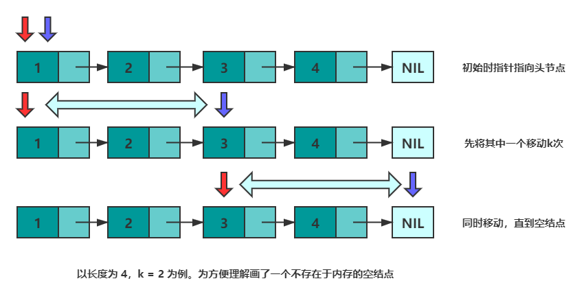 设有两个指针 p 和 q,初始时均指向头结点。首先,先让 p 沿着 next 移动 k 次。此时,p 指向第 k+1 个结点,q 指向头节点,两个指针的距离为 k 。然后,同时移动 p 和 q,直到 p 指向空,此时 q 即指向倒数第 k 个结点。可以参考下图来理解: