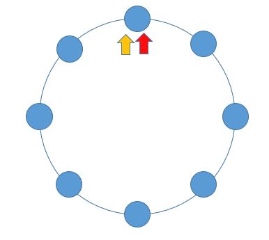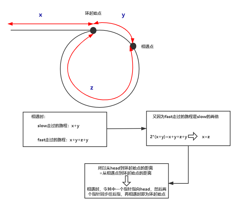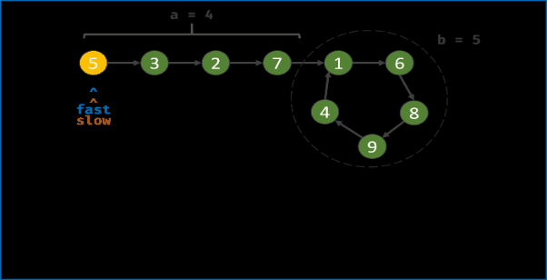 当一个链表有环时,快慢指针都会陷入环中进行无限次移动,然后变成了追及问题。想象一下在操场跑步的场景,只要一直跑下去,快的总会追上慢的。当两个指针都进入环后,每轮移动使得慢指针到快指针的距离增加一,同时快指针到慢指针的距离也减少一,只要一直移动下去,快指针总会追上慢指针。