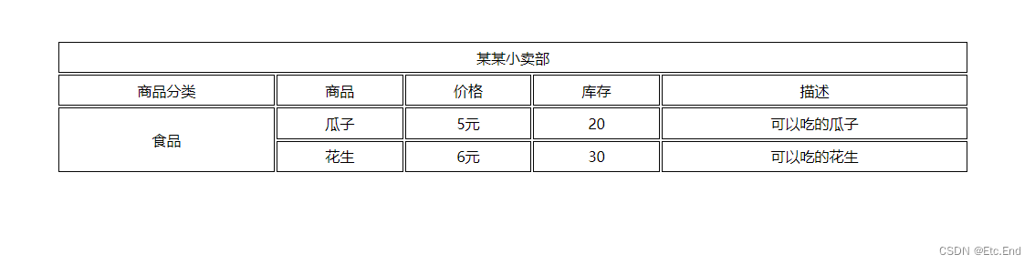 某某小卖部 商品分类 商品 价格 库存 描述 食品 瓜子 5元 20 可以吃的瓜子 花生 6元 30 可以吃的花生