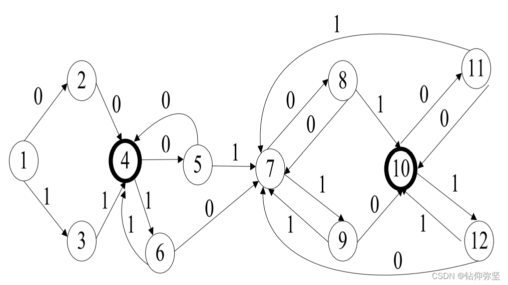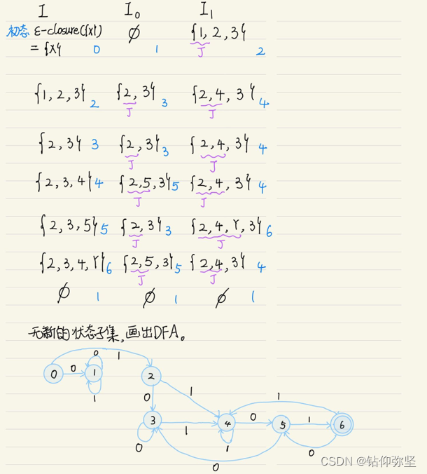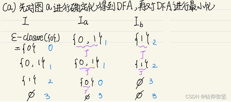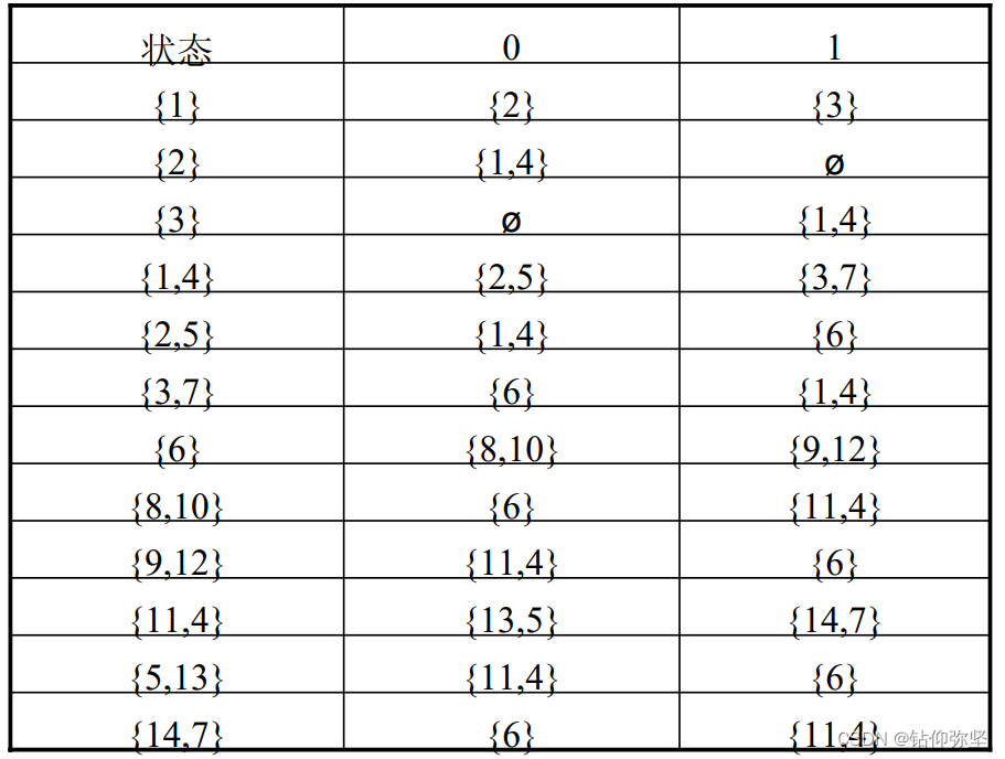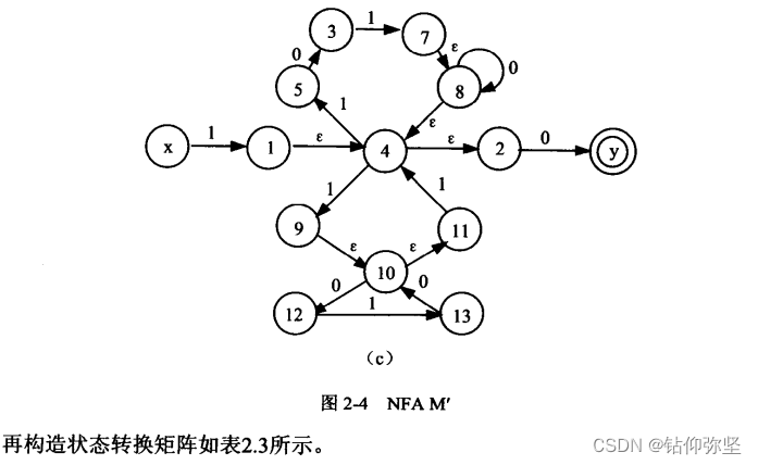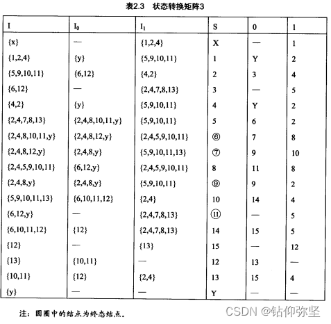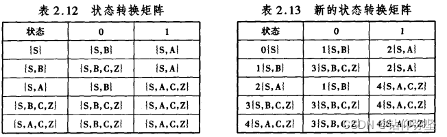 对上图中的状态转换图进行确定化,得到表 2.12。 给状态编号,得到表 2,13 所列的状态转换矩阵。