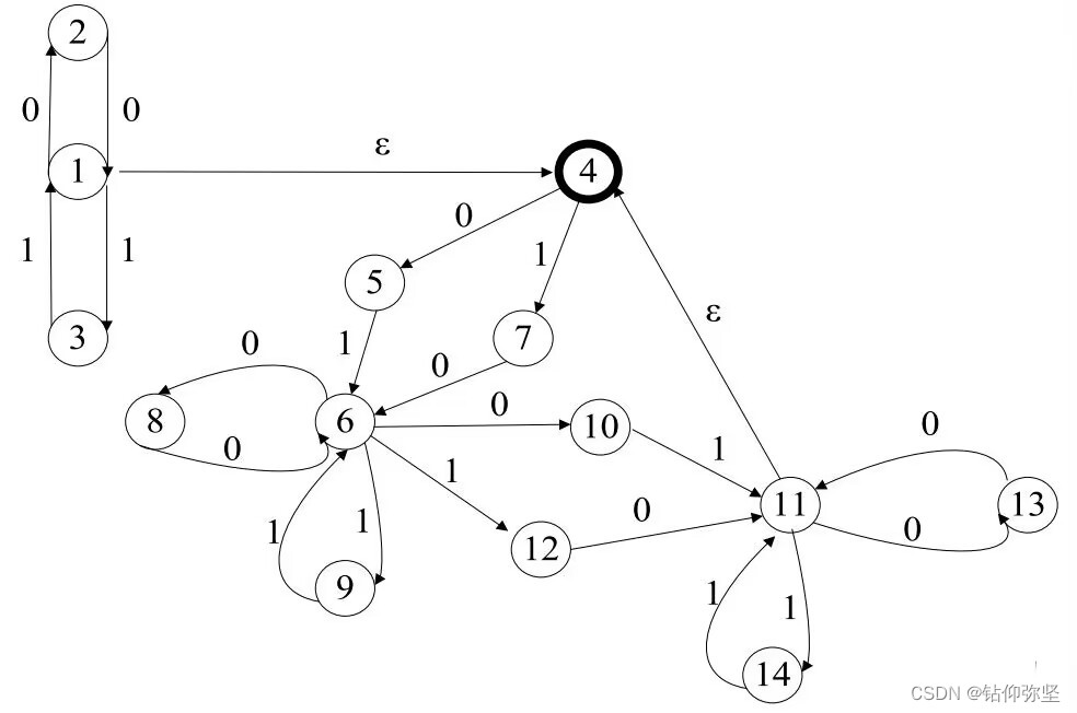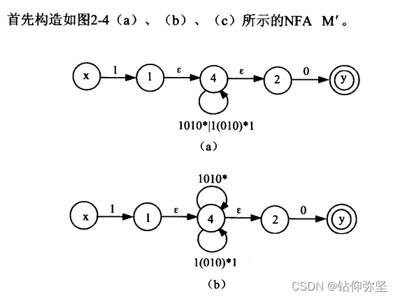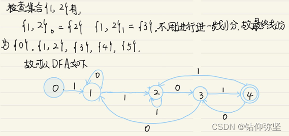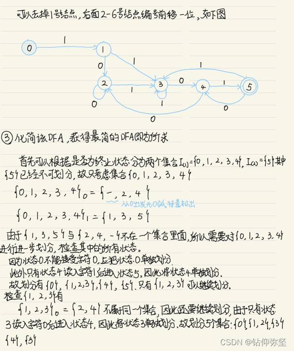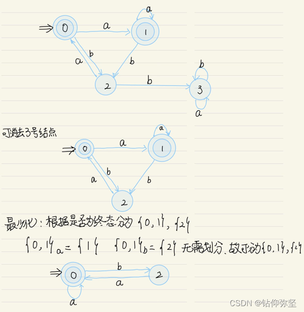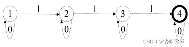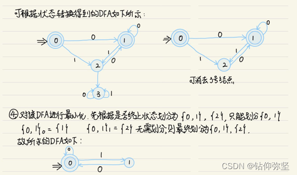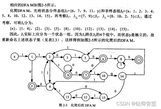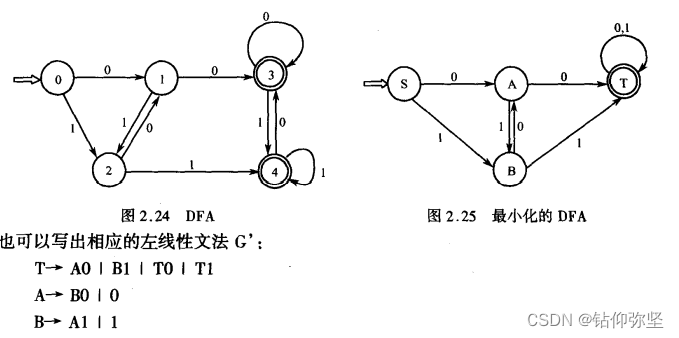 根据状态转换矩阵获得如图 2.24 所示的 DFA。 还可以对上图的 DFA 进行化简,状态 3 和 4 可以合并,化简后的 DFA 如图 2.25 所示。