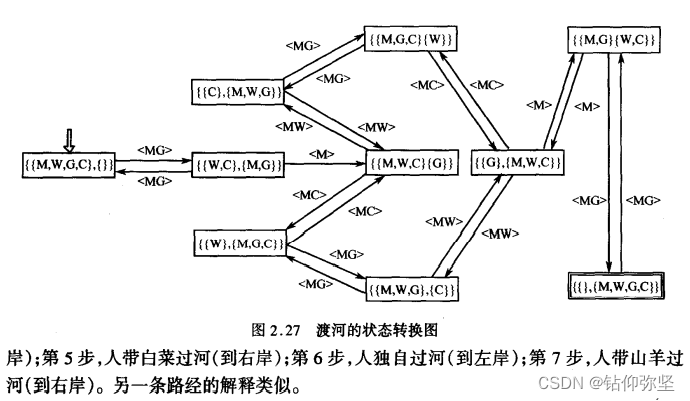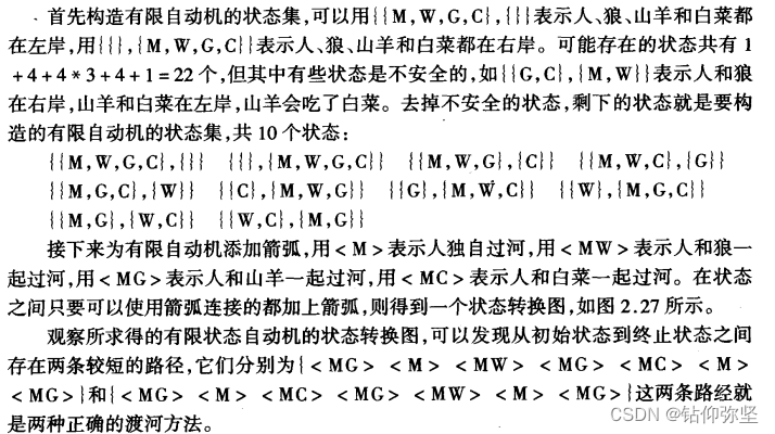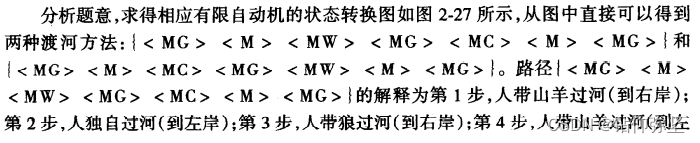 答:这是一道经典的智力题,很显然是有办法渡河的,关键是如何用有限自动机来求解渡河的方法。有限自动机描述的是状态和状态之间的转换,对于本题,可以把人、狼、山羊和白菜都在左岸作为有限自动机的初始状态,而把他们都在右岸作为终止状态,只要构造一 个自动机使得存在一条从初始状态到终止状态的路径就可以了。