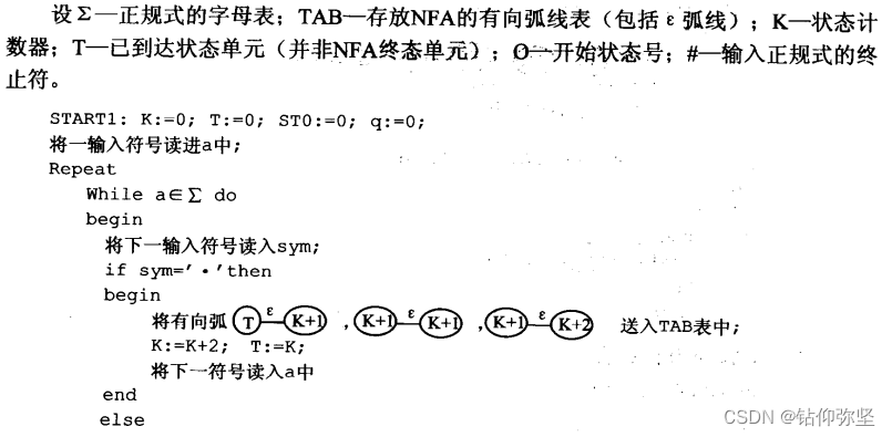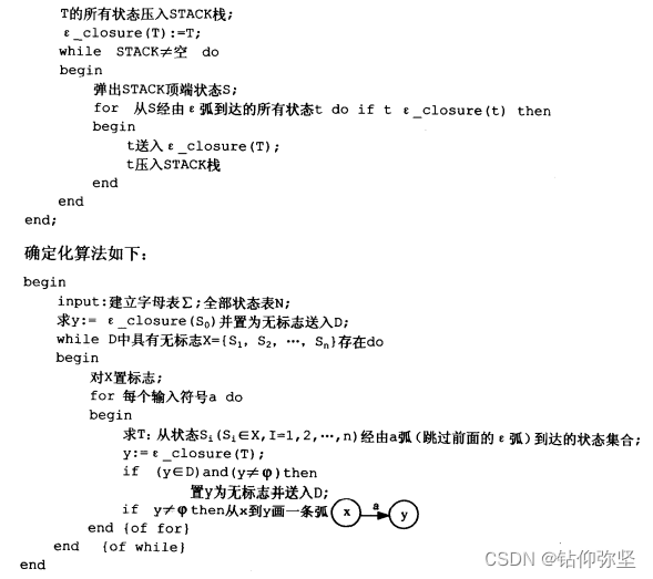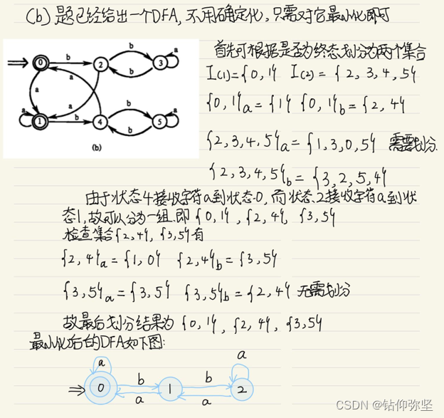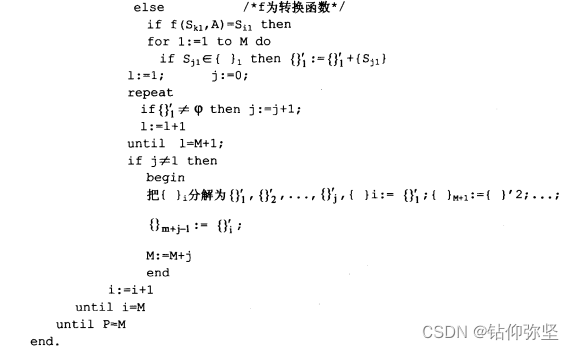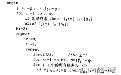 假定DFA有N个状态,我们用{}i表示已分解了的状态子集,用{}i'表示临时分解的状态子集;而M是根据定义不断扩大的非等价的状态子集个数;P是在M扩大前的非等价的状态子集个数。只有当M不再扩大时,有P=M,则其算法可描述如下:
