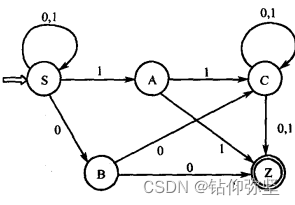 不难看出,该 DFA 接受的语言是{0,1}上包含00 或11的字符串。根据图2.25,我们