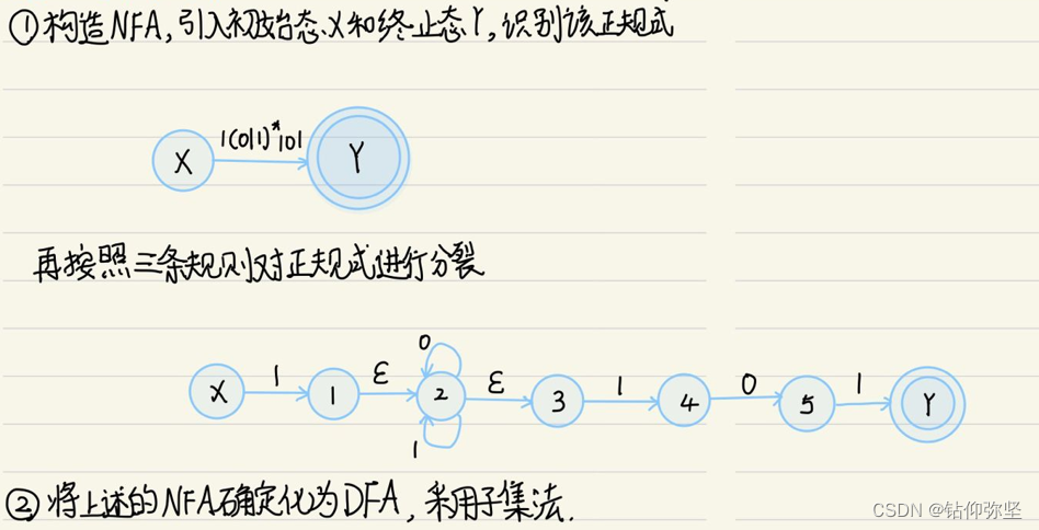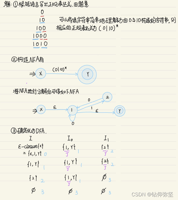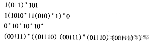 (1)分析题意,要求的是二进制串,即由0和1构成的串,并且必须以 01 结尾,所以本题可以分两部分去完成,一部分实现由0和1构成的任意串,一部分即 01,然后将它们 连接到一起就可以了,所以本题的解答是:(1|0)*01。