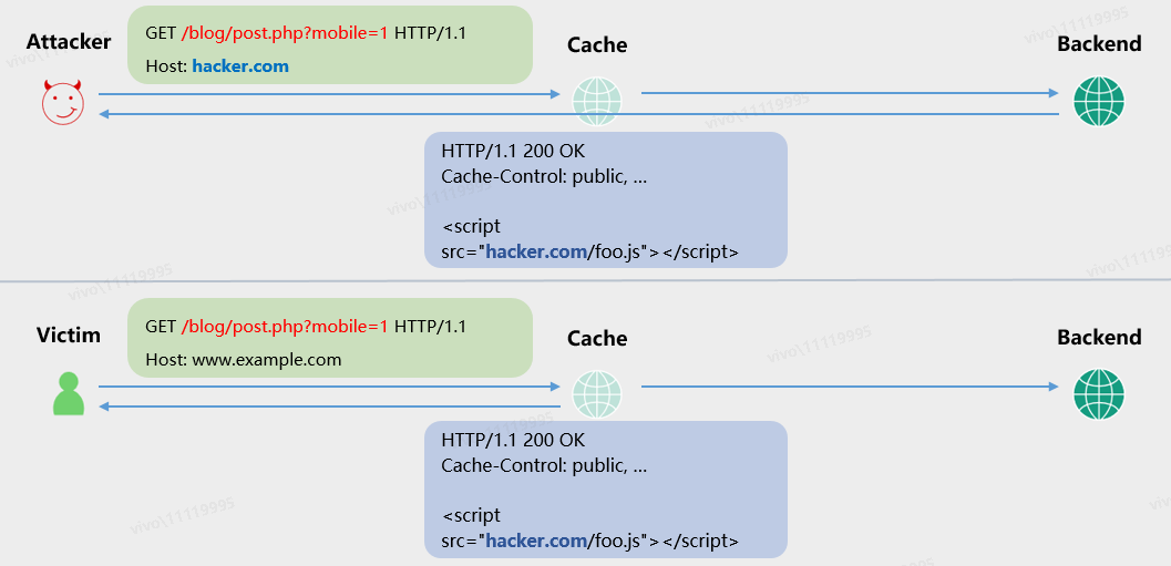 当攻击者的请求中,缓存键和普通用户没有差别,而请求中其它部分存在可体现在响应包中的恶意内容或代码时,该响应被缓存后,其它请求了同一个正常缓存键对应接口的用户会直接得到攻击者提前交给缓存服务器缓存的恶意响应。