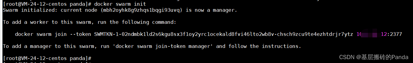 docker swarm join --token SWMTKN-1-02ndmbk1ld2s6kgu8sx3f1oy2yrc1ocekald8fvi46lto2wb8v-chsch9zcu9te4ezhtdrjr7ytz 10.xxx.xxx.12:2377