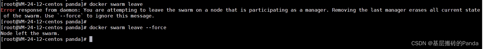 docker swarm leave --force # master 节点需要使用 --force参数,强制离开