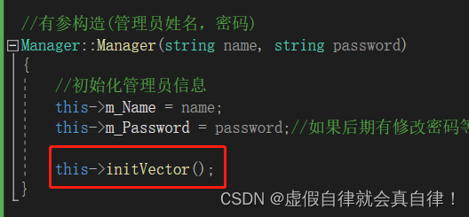 {//初始化管理员信息this->m_Name = name;this->m_Password = password;