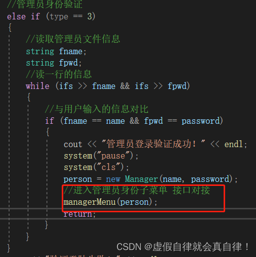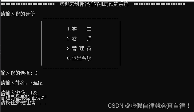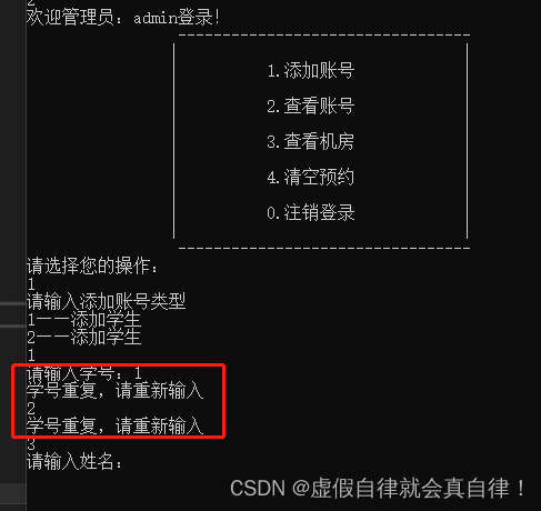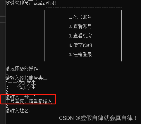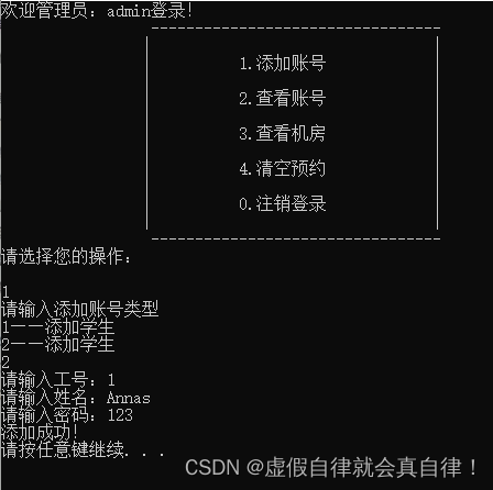 {while (1){//调用管理员子菜单manager->openMenu();//利用多态 父类指针创建子类对象//将父类指针转为子类指针,调用子类的其他接口Manager* admin = (Manager*)manager;//接收用户选择功能int select = 0;cin >> select;//框架搭建 建立接口switch (select){case 1://添加账号admin->addPerson();break;case 2://查看账号admin->showPerson();break;case 3://查看机房信息admin->showComputer();break;case 4://清空预约admin->clearFile();break;default://默认情况下注销登录 释放堆区数据delete manager;//释放堆区数据 手动开辟手动释放cout << "注销成功!" << endl;system("pause");system("cls");break;}}