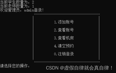 {cout << "欢迎管理员:"<m_Name << "登录!" << endl;cout << "\t\t ---------------------------------\n";cout << "\t\t| |\n";cout << "\t\t| 1.添加账号 |\n";cout << "\t\t| |\n";cout << "\t\t| 2.查看账号 |\n";cout << "\t\t| |\n";cout << "\t\t| 3.查看机房 |\n";cout << "\t\t| |\n";cout << "\t\t| 4.清空预约 |\n";cout << "\t\t| |\n";cout << "\t\t| 0.注销登录 |\n";cout << "\t\t| |\n";cout << "\t\t ---------------------------------\n";cout << "请选择您的操作: " << endl;